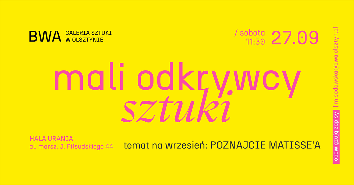 Serdecznie zapraszamy na spotkanie z cyklu "Mali odkrywcy sztuki", które odbędzie się 27 września (sobota) o godz. 11:30 w tymczasowej siedzibie galerii w HALI URANIA – al. Marsz. J. Piłsudskiego 44, Olsztyn.