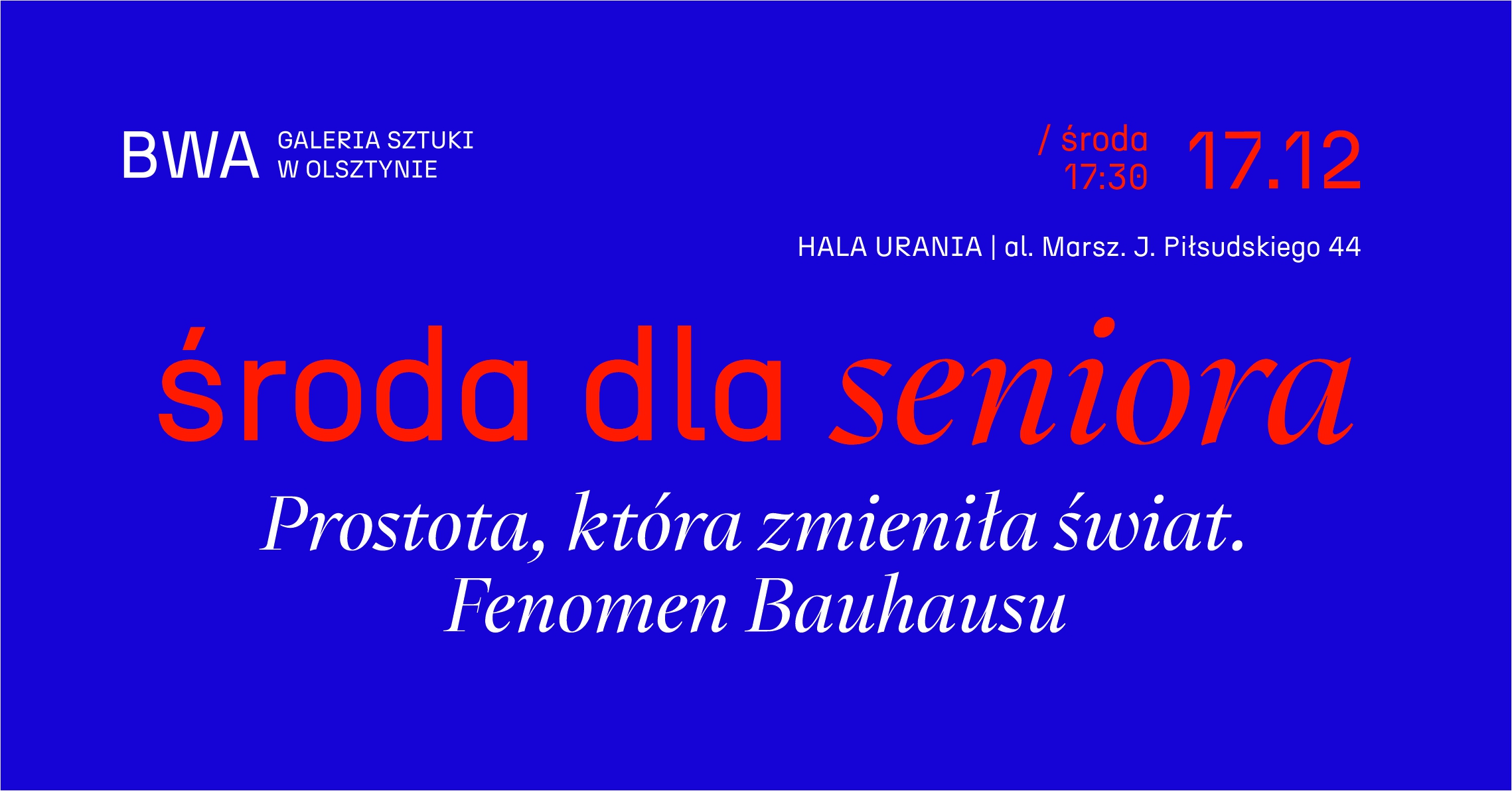 BWA Galeria Sztuki w Olsztynie serdecznie zaprasza na spotkanie z cyklu "Środa dla seniora", które odbędzie się 18 grudnia (środa) o godz. 17:00 w siedzibie galerii – Piłsudskiego 38, Olsztyn....