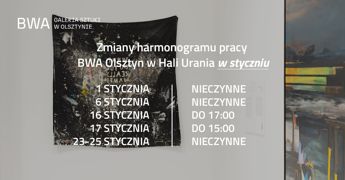 Galeria Sztuki BWA w Olsztynie - godziny otwarcia: wtorek - piątek 10:00 - 18:00 / sobota - niedziela 11:00 - 18:00