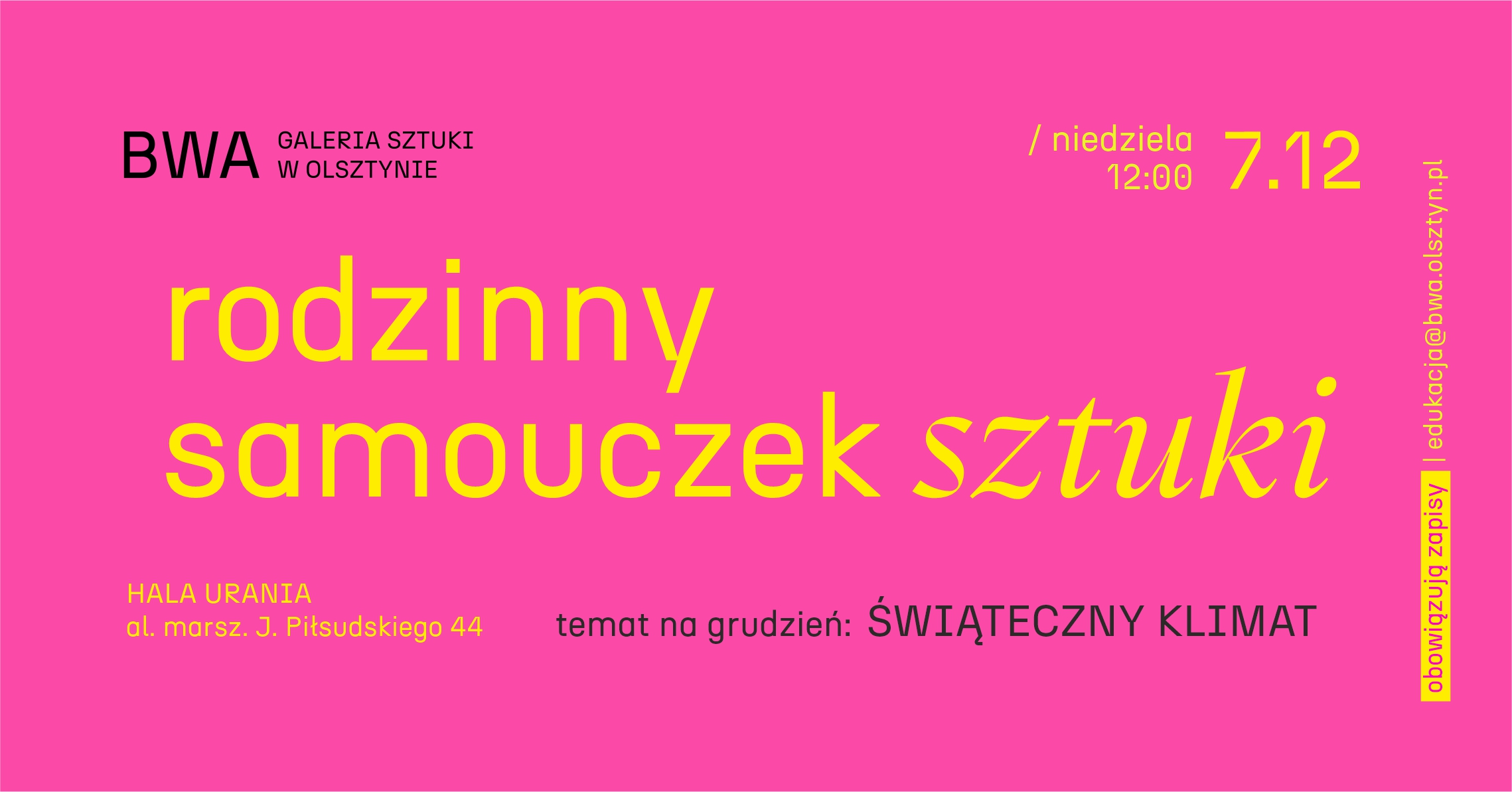 BWA Galeria Sztuki w Olsztynie kolejny raz przyłącza się do Europejskiej Noc Muzeów. To noc, podczas której galerie i muzea pozostają otwarte po zmroku, odkrywając skarby ze swoich zbiorów bądź szykując specjalne prezentacje. Jest to szczególna noc i szczególne wydarzenie kulturalne - umożliwia zwiedzanie wystaw osobom, które w zabieganym dniu nie mają czasu na uczestniczenie w imprezach artystycznych....
